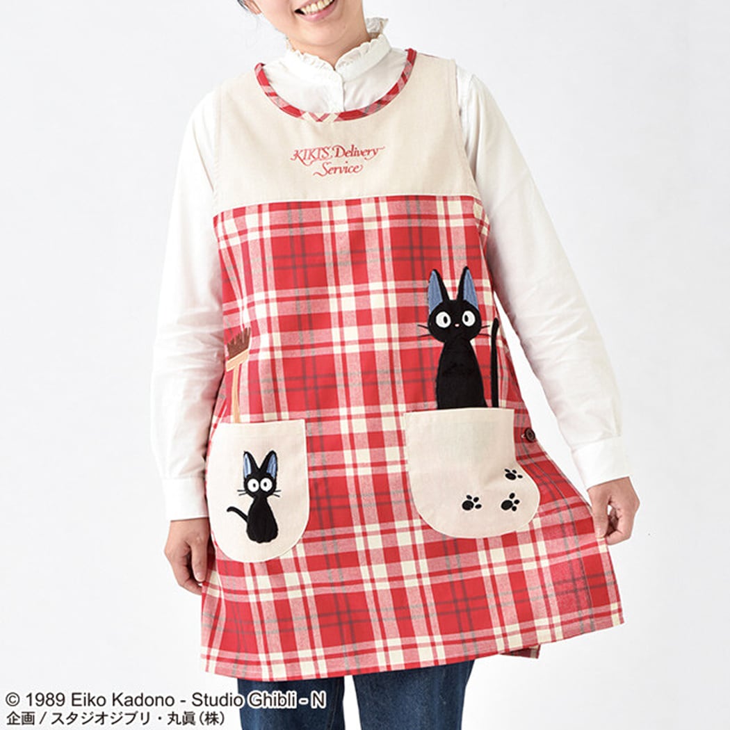 スタジオジブリ「魔女の宅急便」に登場する黒猫「ジジ」の割烹着型エプロンです。上からかぶるスタイルなので、簡単に着用できます。使いやすい大きなポケット付き。