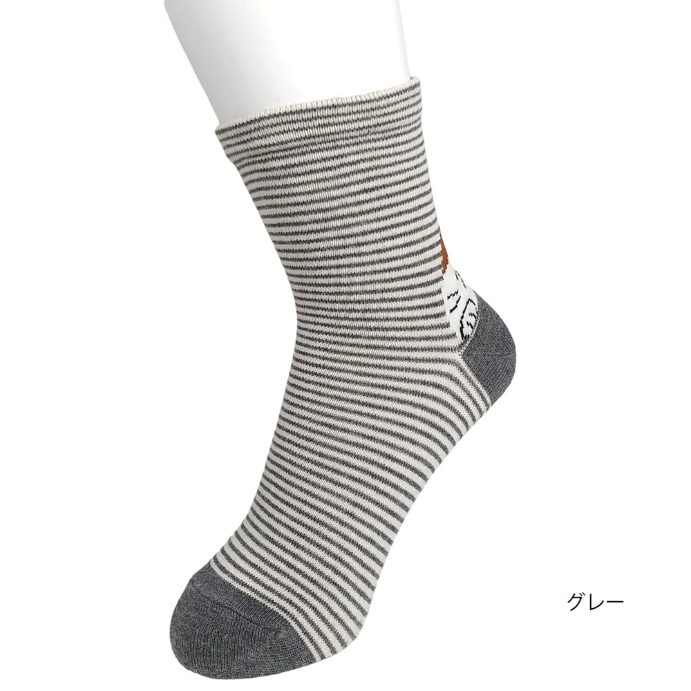 かかとから顔を出した三毛猫がかわいいピンボーダー柄の靴下です。ゴム無しで履き心地の良い仕上がりになっています。ブラック、ネイビー、グレー、ライトブラウン、ボルドー、の5種類があります。