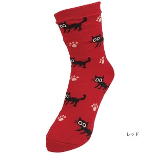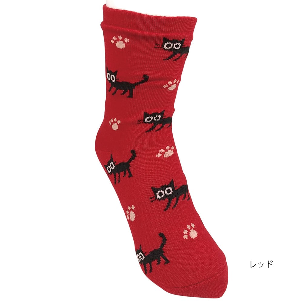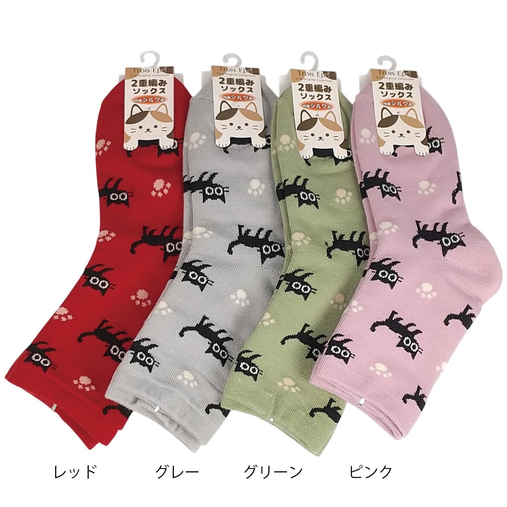 黒猫と足跡のデザインがかわいい、内側シルク混の靴下です。2重編みで保温性が高い仕上がりになっています。レッド、グレー、グリーン、ピンク、の4種類があります。
