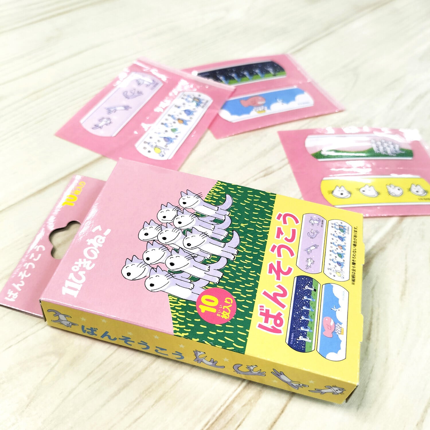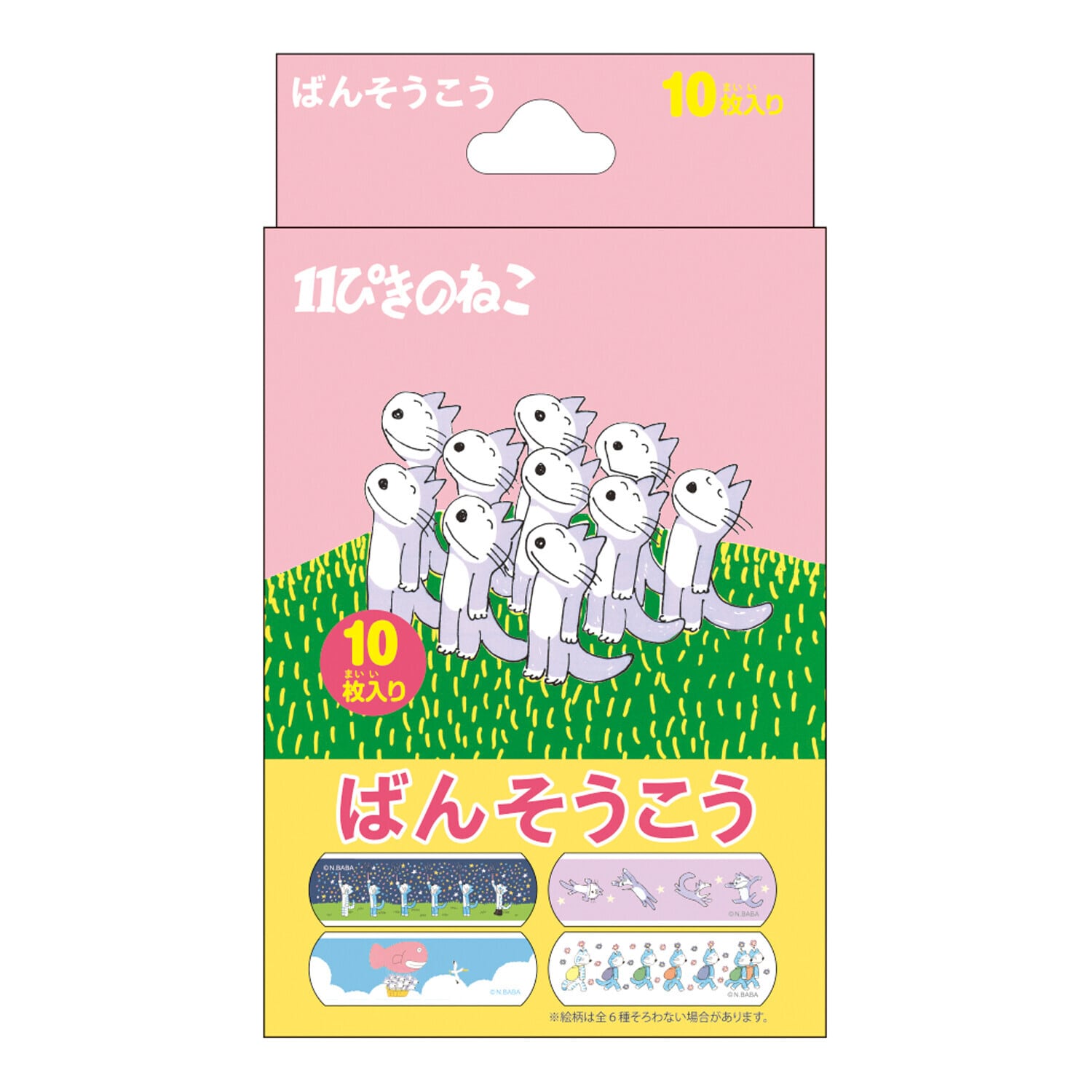 馬場のぼるさんのロングセラー絵本「11ぴきのねこ」の、かわいい絆創膏です。きり傷、すり傷、くつずれなどの創傷面の保護にご利用ください。10枚入り。絵柄は全6種そろわない場合があります。【使用期限2027年1月】