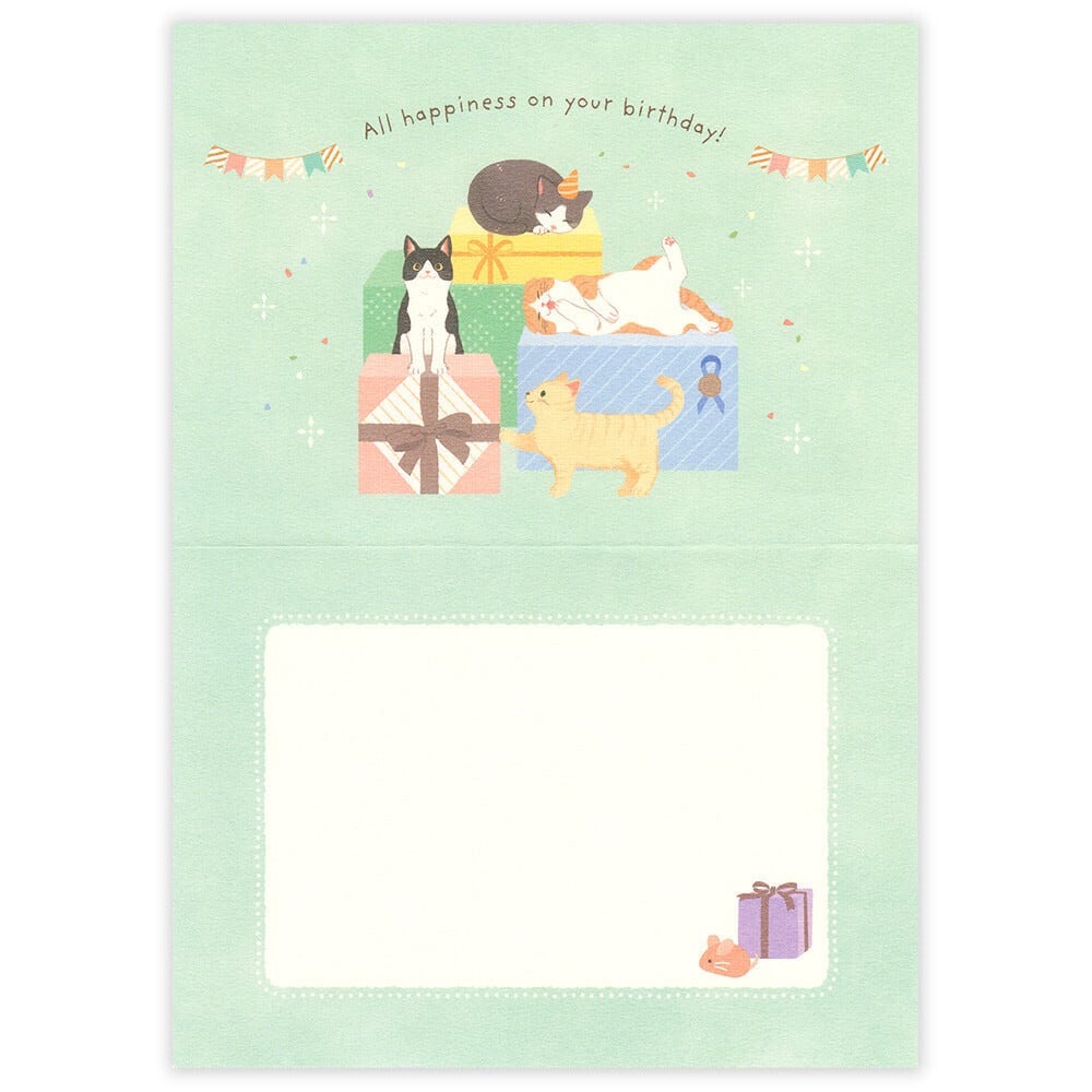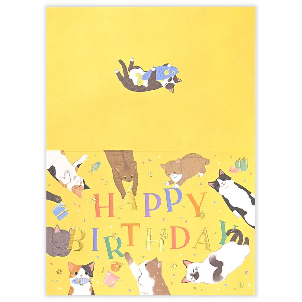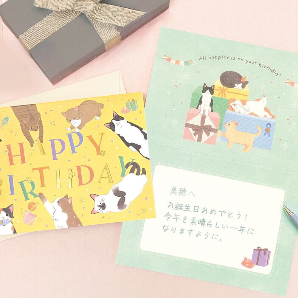 かわいい猫たちがお祝いの気持ちを届けてくれるバースデーカードです。エンボス加工と金箔押し加工がカードを華やか。メッセージを書くスペースのある絵柄付中紙入。洋形2号封筒付き。