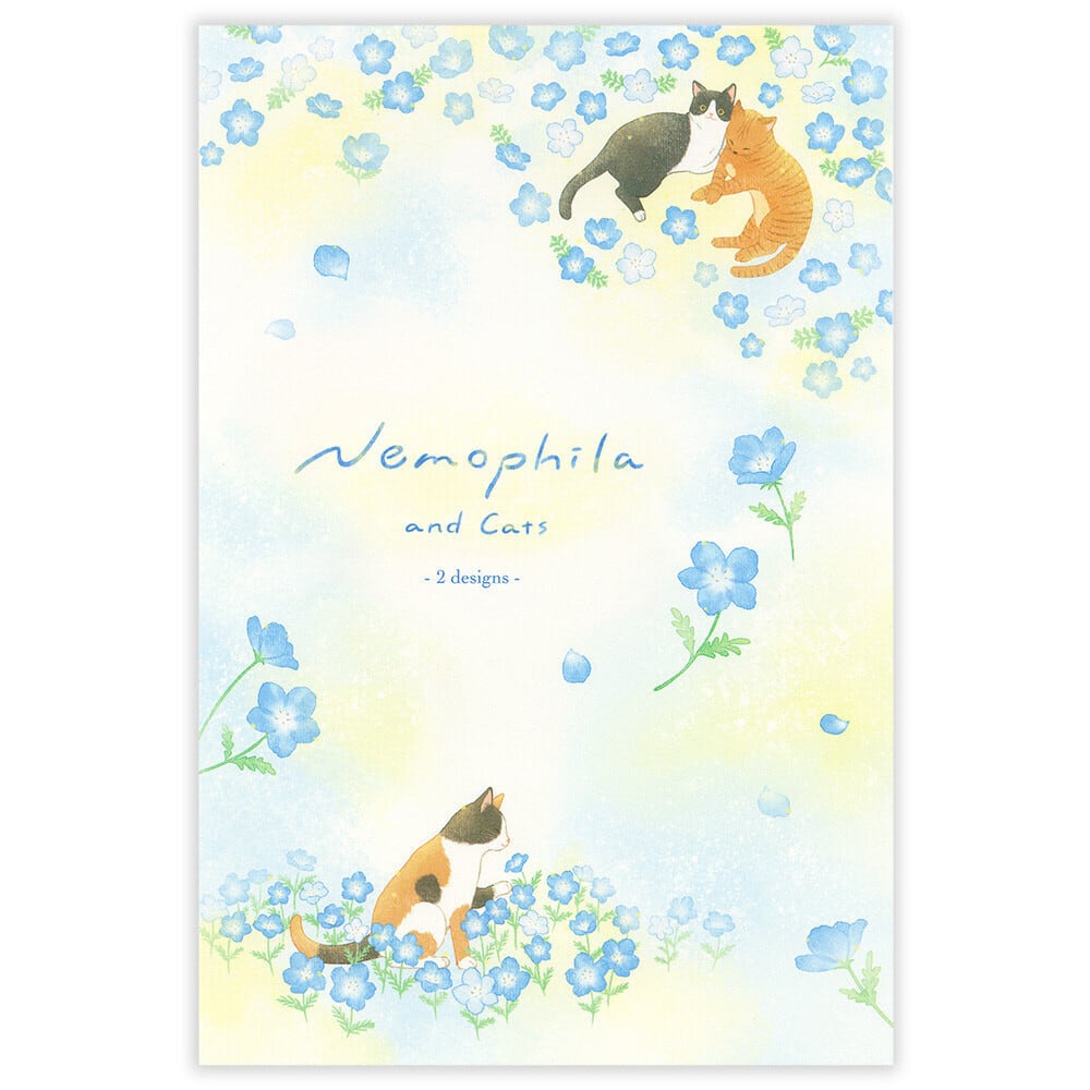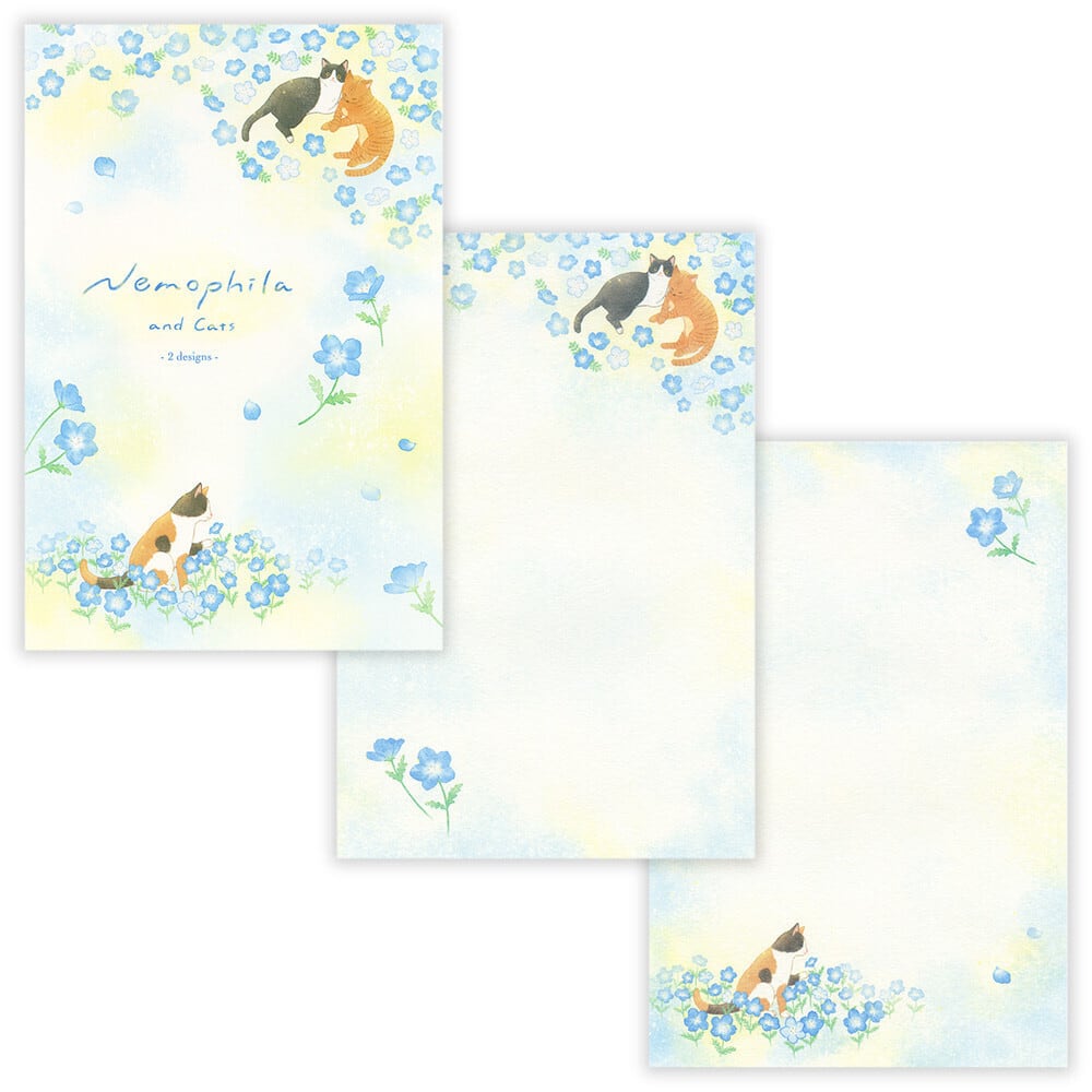 初夏を彩るさわやかなネモフィラと猫を描いた便箋です。水彩で描いた優しい雰囲気が、季節のご挨拶や友人へのお手紙などにオススメ。風合いのある和紙を使用し、2柄を楽しめる仕様になっています。無罫(罫台紙入り)。A5相当2柄アソート。【全16枚入り】