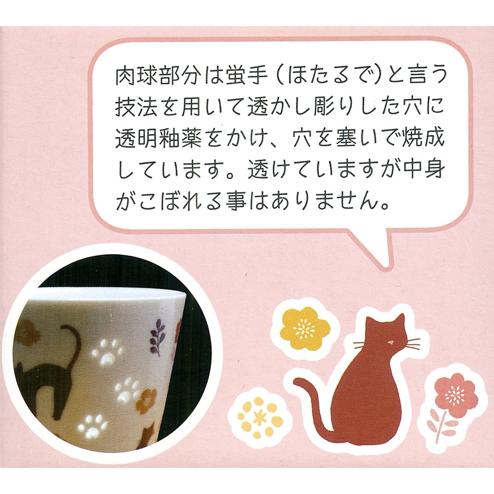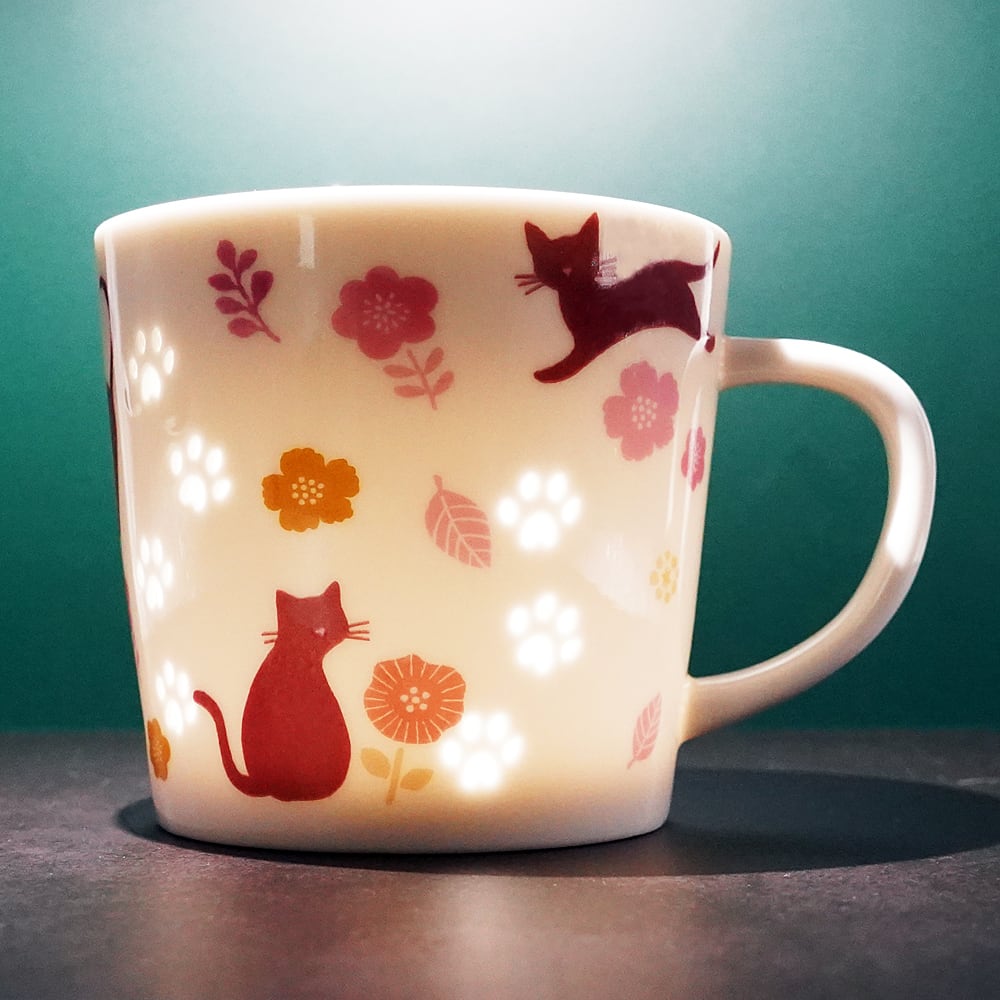 飲み物を入れると肉球が浮かび上がる、大人気の透かしマグカップです。外側には猫のシルエット、お花や葉っぱがぐるりとデザインされています。肉球部分は蛍手(ほたるで)と言う技術を用いて透かし彫りした穴に透明釉薬をかけ、穴を塞いで焼成しています。光が透けていますが中身がこぼれる事はありません。容量は約300ml。電子レンジ対応、食洗機対応。磁器製品の性質上、色やサイズに多少の違いが出たり、表面などに焼き色や点、擦れや凹凸が入る場合があります。あらかじめご了承ください。