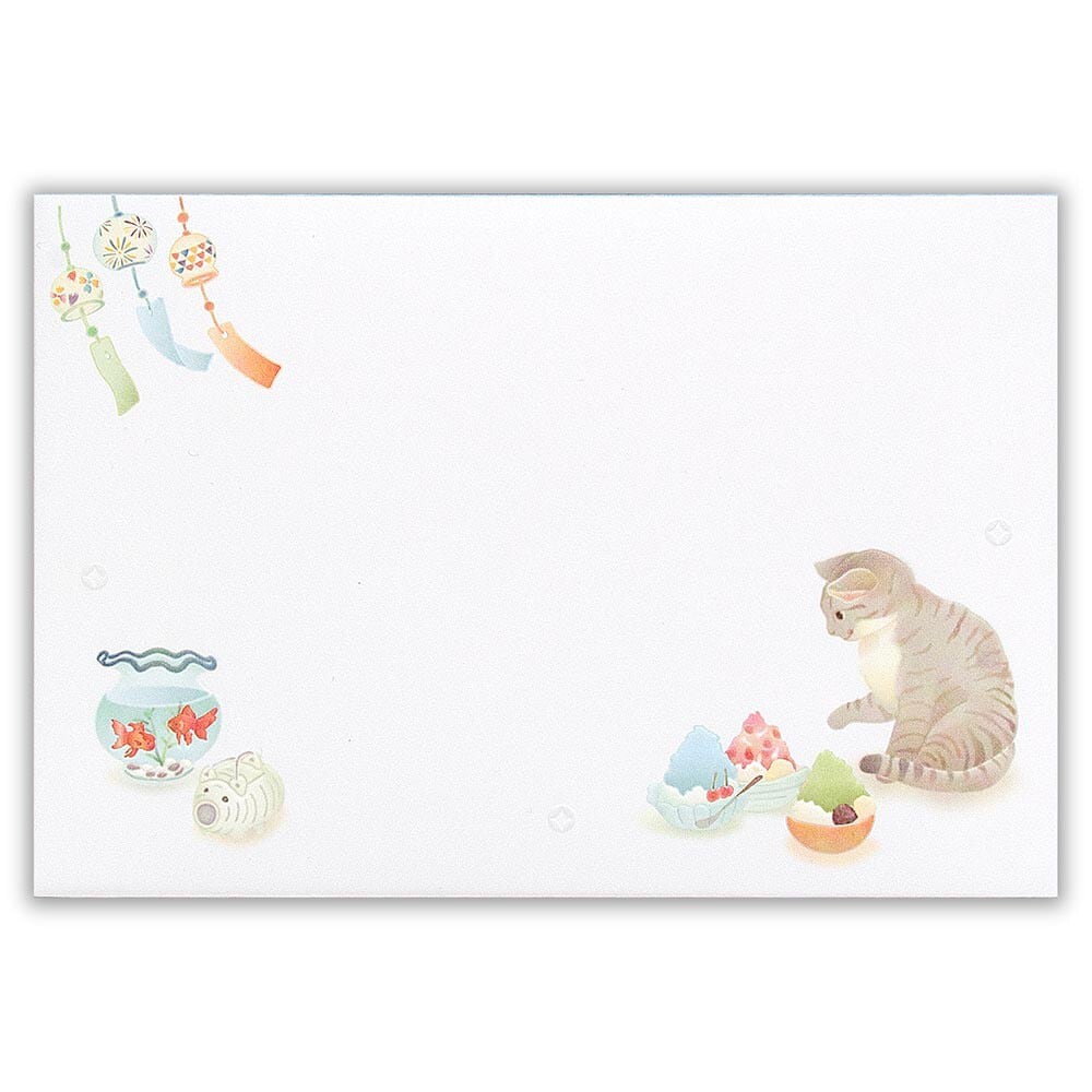 夏の風物詩と猫たちの姿がカワイイ封筒です。スイカにもたれかかったり、かき氷が気になったり、無邪気なしぐさが愛くるしい猫たちが、夏のおたよりにピッタリ。4枚入。エンボス加工。同シリーズの封筒「猫便箋(A5夏の風物詩)」もあります。