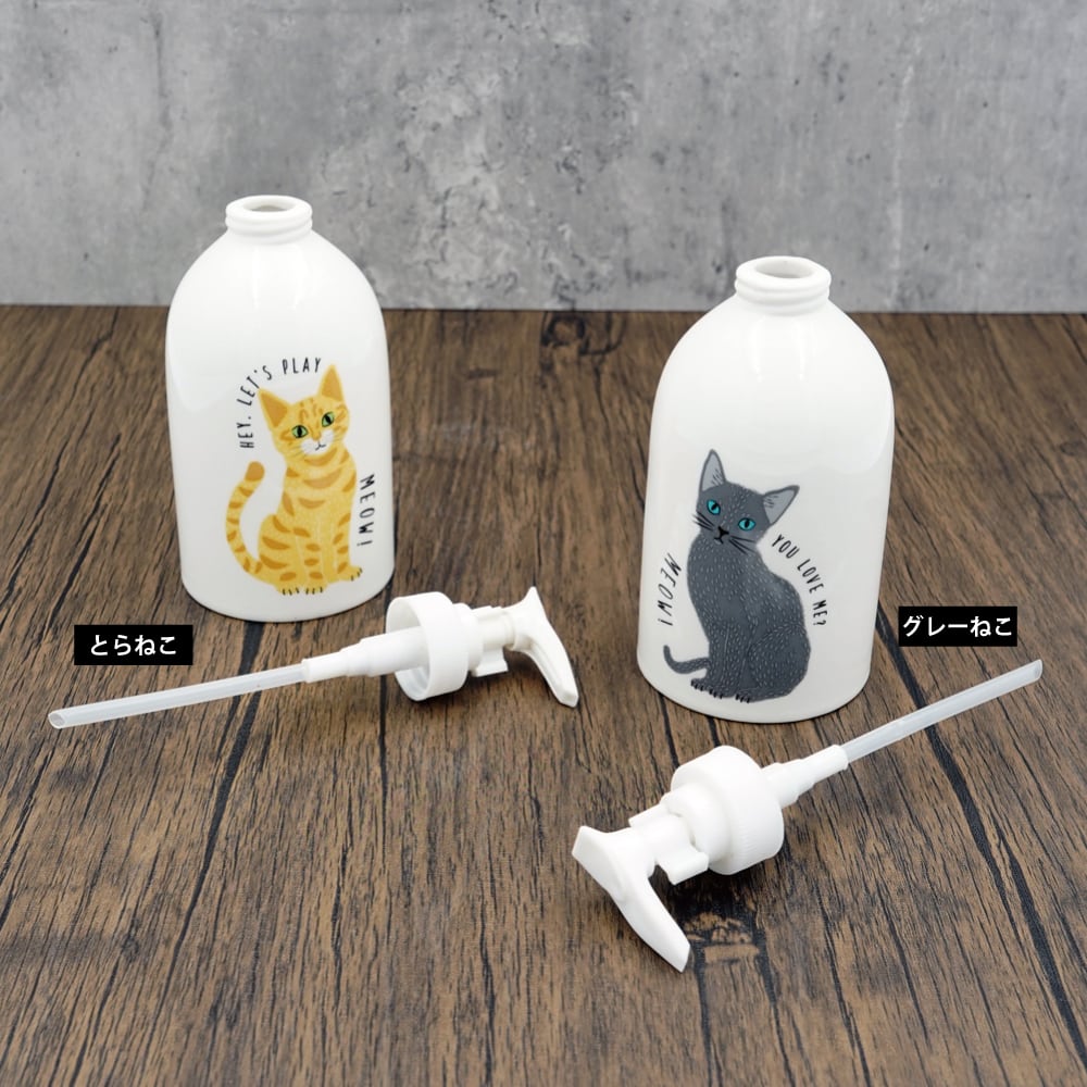 愛くるしい猫たちがデザインされたソープディスペンサーです。液体ハンドソープなどを入れてお使いください。容量350ml。とらねこ、グレーねこ、くろねこ、の3種類があります。材質の特性上、色やサイズに多少の違いが出たり、表面などに焼き色、擦れや凹凸などが入る場合があります。あらかじめご了承ください。