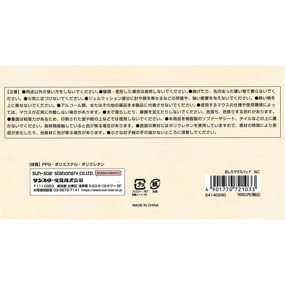 ぷにぷにした猫のおしりに癒されるマウスパットです。弾力のあるジェルクッションで手首をやさしく支えるプニプニジェルクッション。表面はマウス操作に最適なさらっとしたストレッチ素材。底面はデスクに吸着するポリウレタン素材を使用しているのでズレを防ぎます。